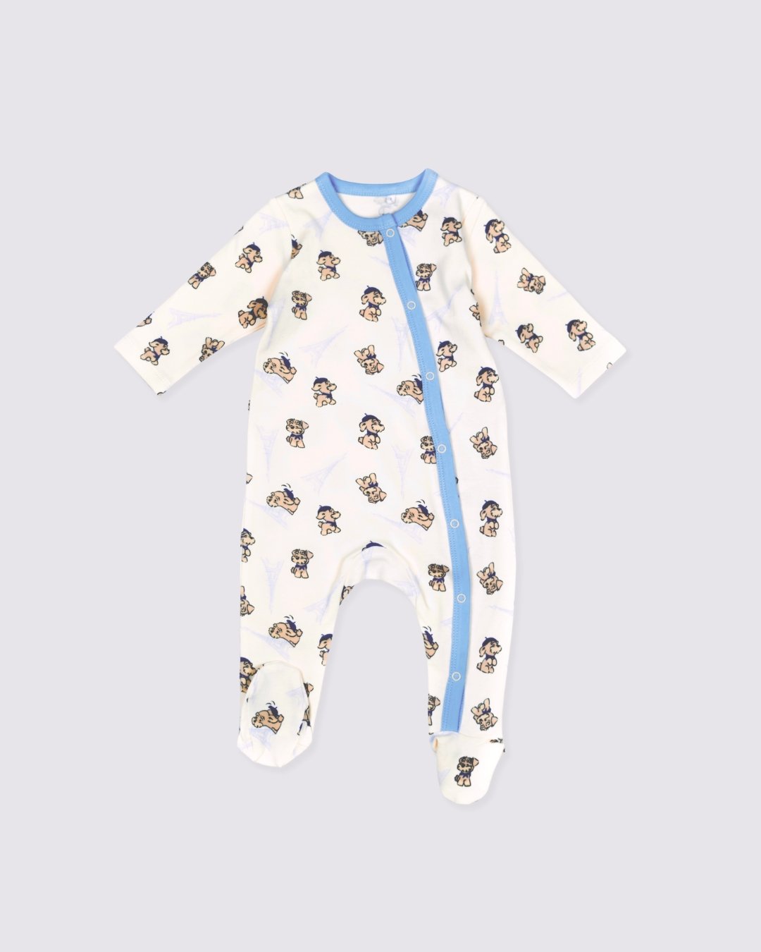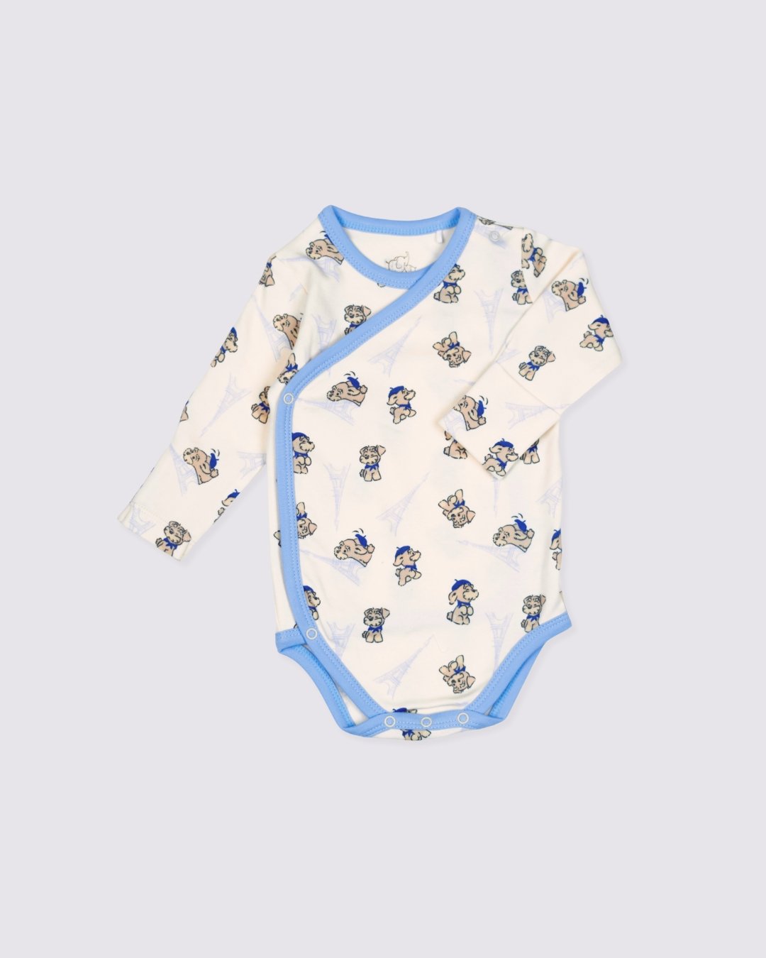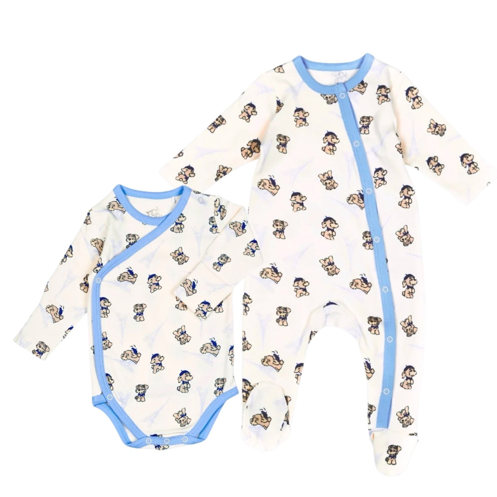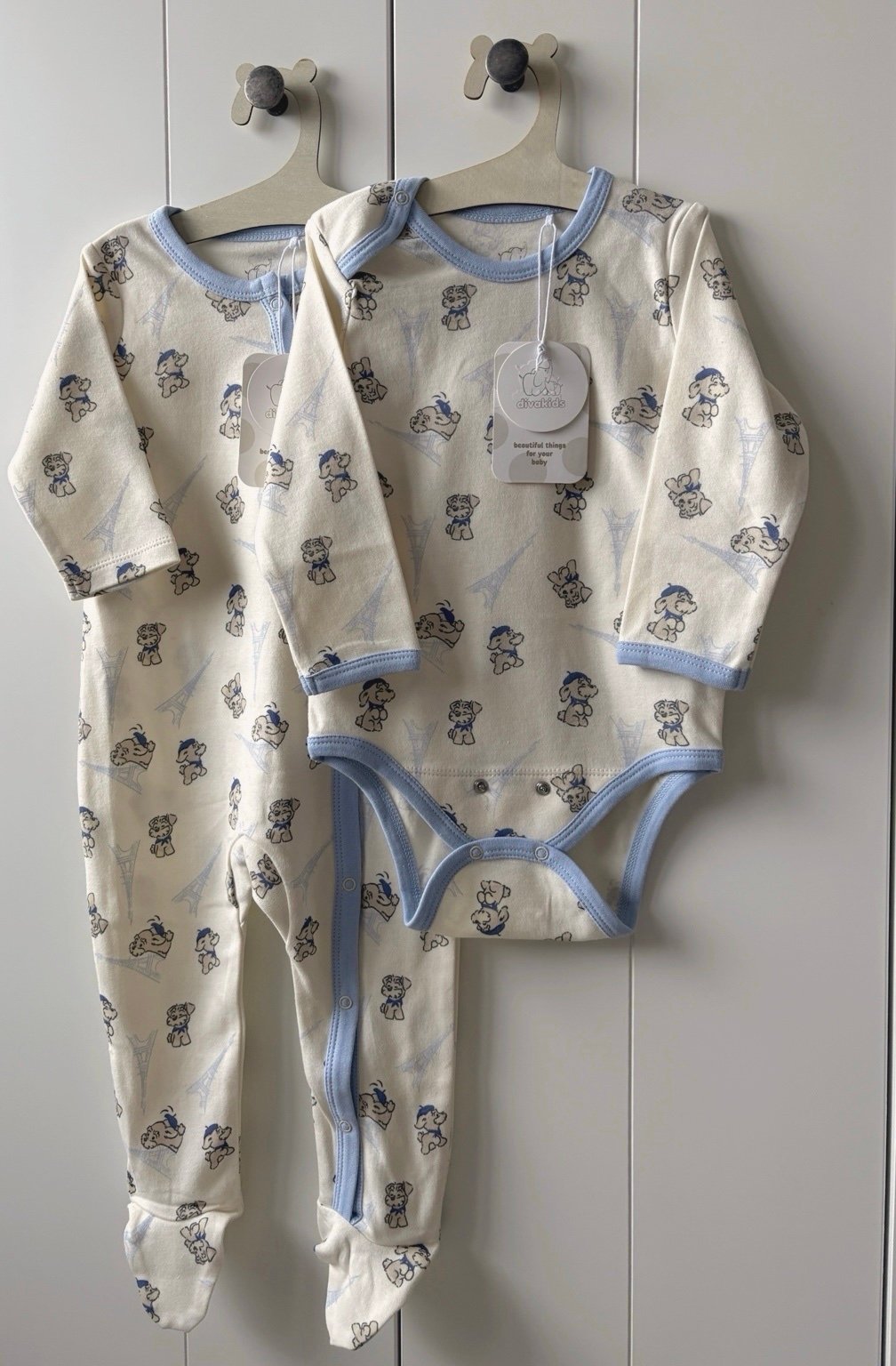 DivaKids kūdikių komplektas „Bleu“ – minkštas ir patogus drabužėlių rinkinys mažylio kasdienai. Komplektą sudaro smėlinukas su papildomomis spaudėmis, leidžiančiomis reguliuoti dydį ir nešioti drabužėlį ilgiau, bei patogus šliaužtinukas. Minkšta ir kvėpuojanti medvilnė užtikrina komfortą tiek žaidžiant, tiek miego metu. Švelni kreminė ir žydra spalvų kombinacija su paryžietiškais akcentais – mini Eifelio bokštais ir žaismingais šuniukais – suteikia komplektui išskirtinio žavesio.