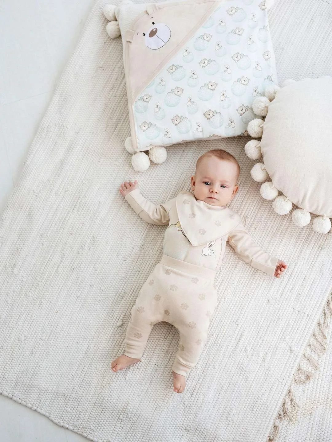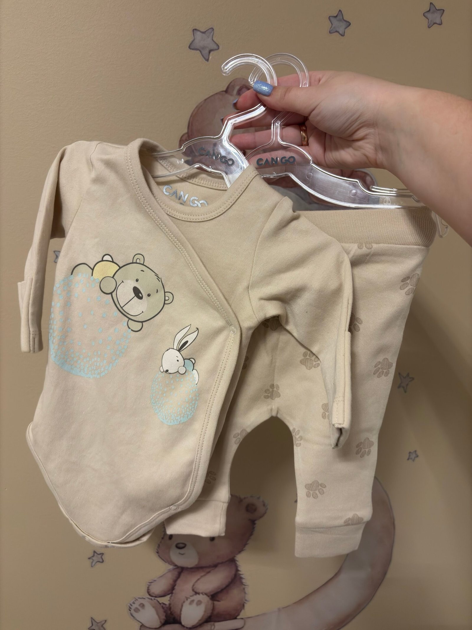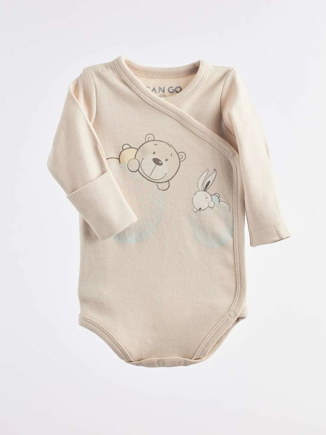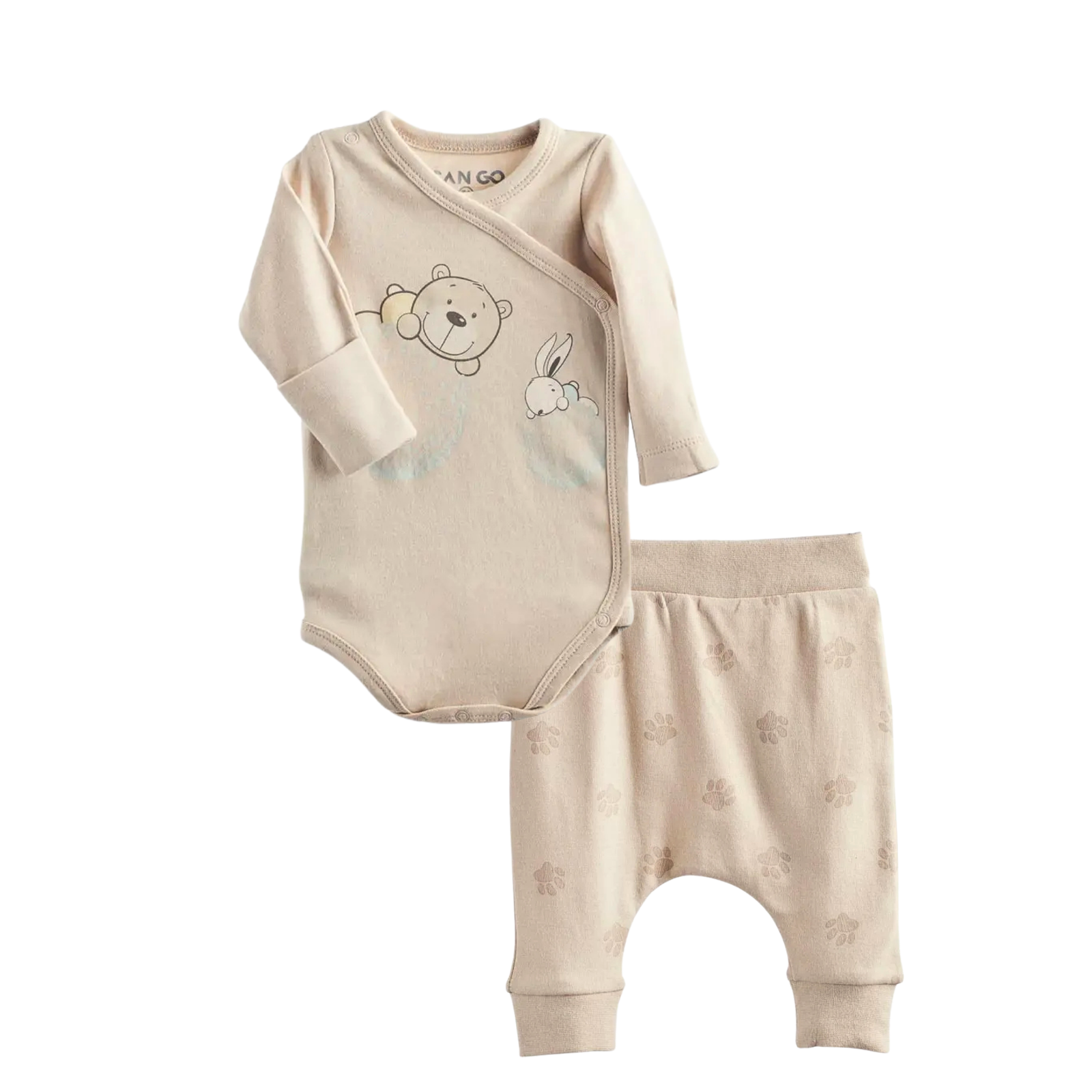 CAN GO naujagimio komplektas „Bear & Bunny“ – minkštas ir patogus drabužėlių rinkinys pirmosioms mažylio dienoms. Švelnios smėlio spalvos komplektas yra neutralus, todėl puikiai tiks tiek berniukui, tiek mergaitei.