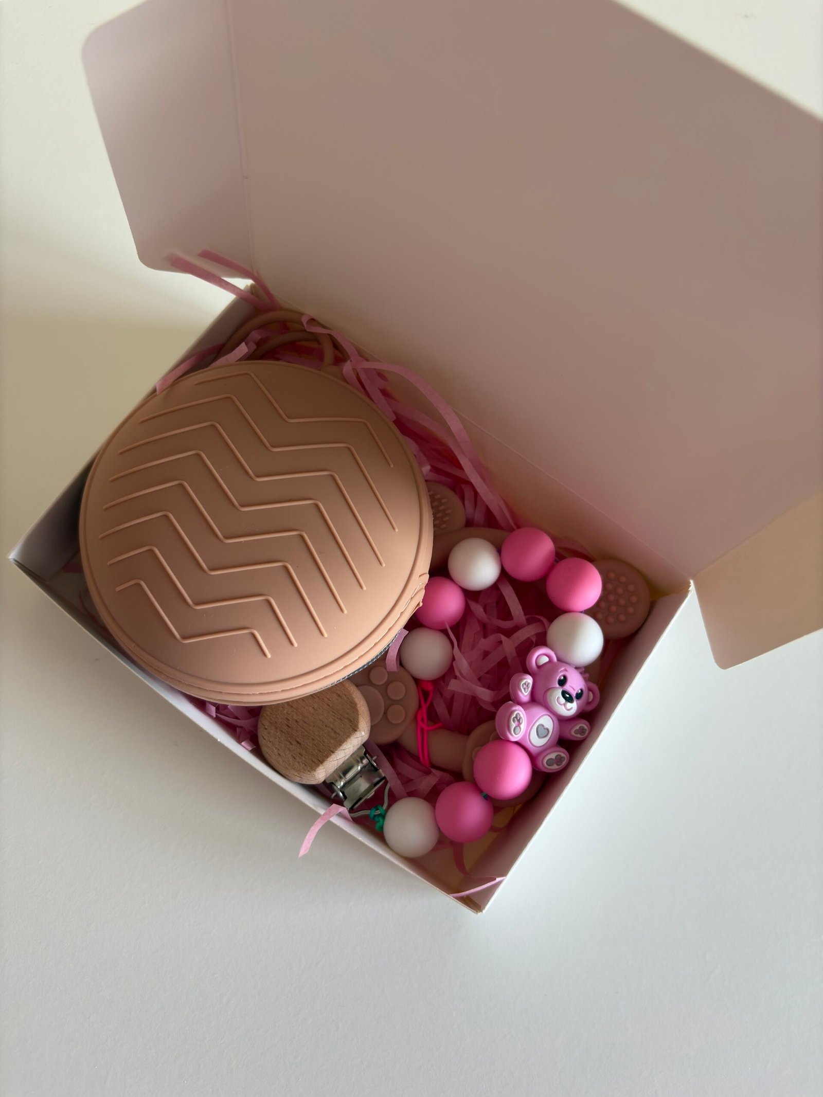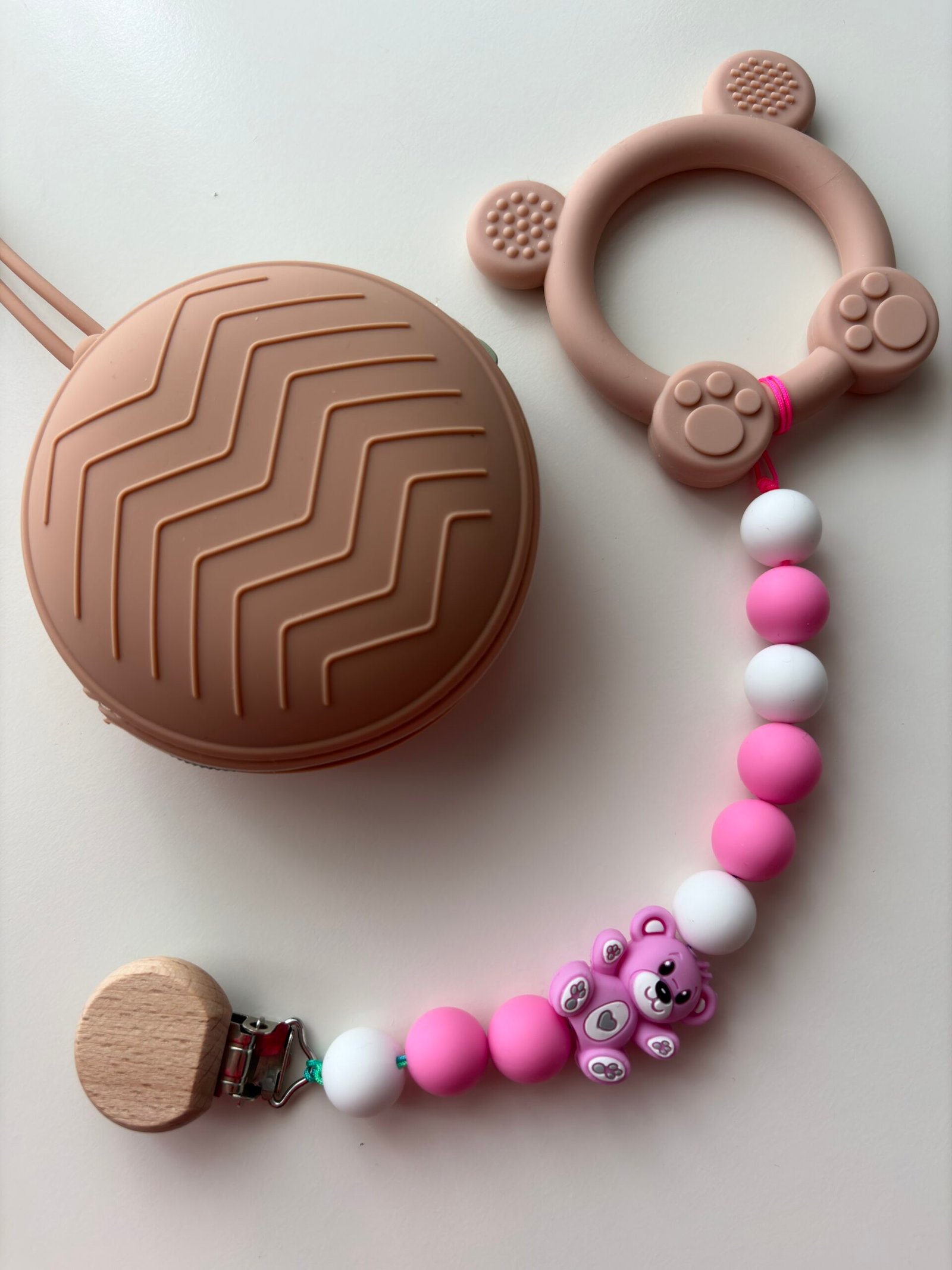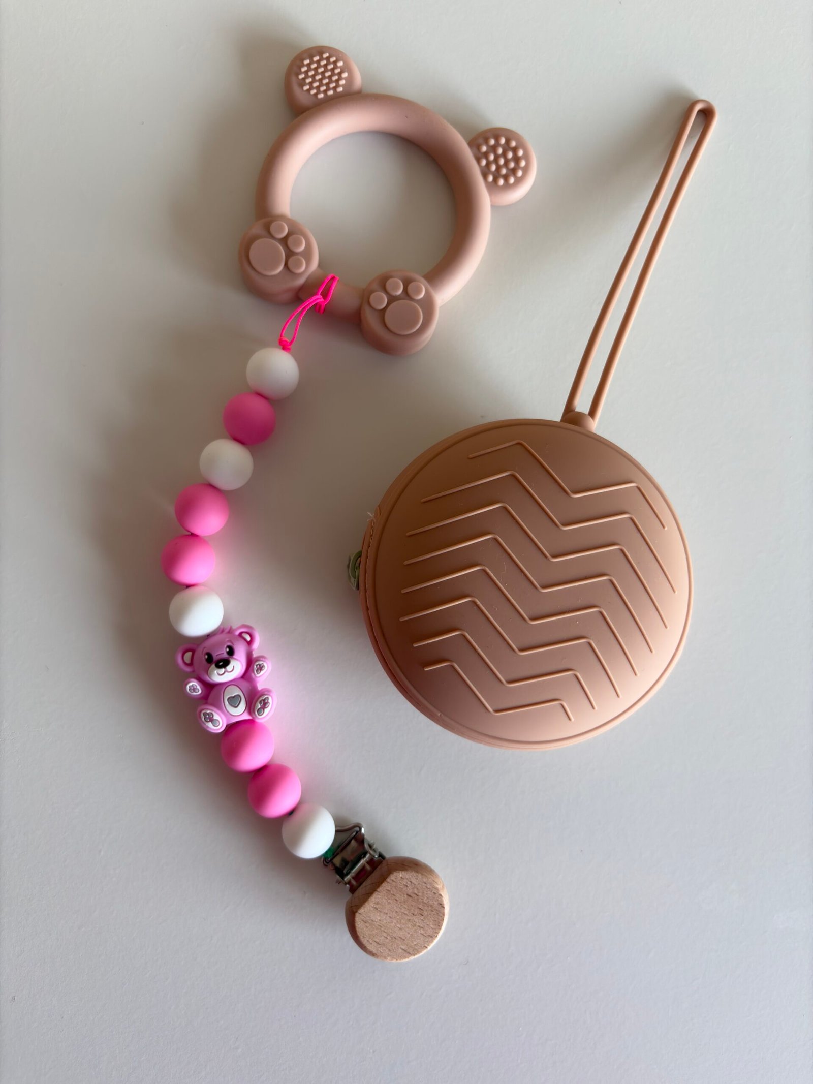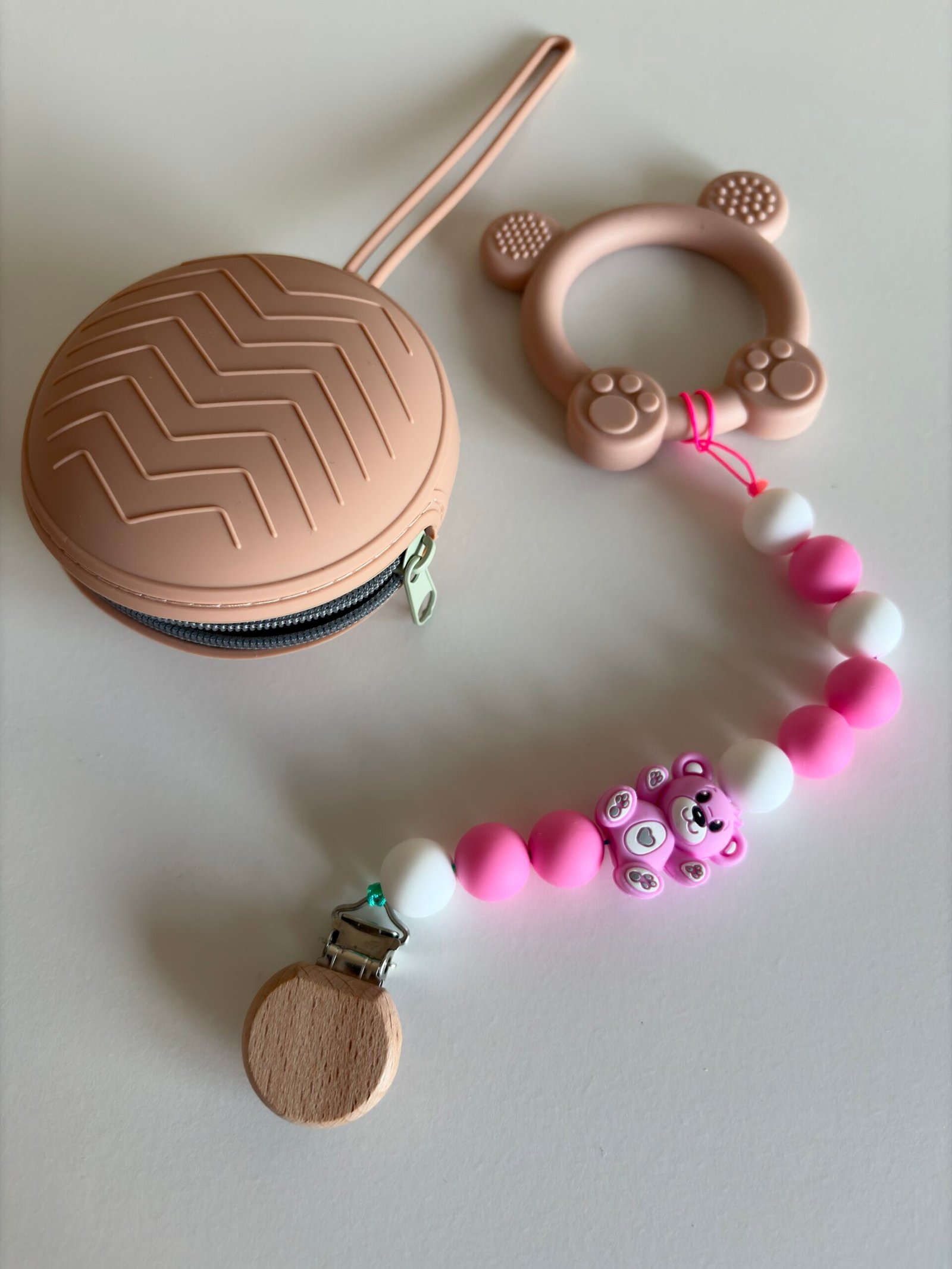 Rožinis rankų darbo Meškučių Trio rinkinukas – stilingas ir praktiškas aksesuarų komplektas mažylei. Rinkinį sudaro laikiklis, kramtukas ir silikoninis deklas.
