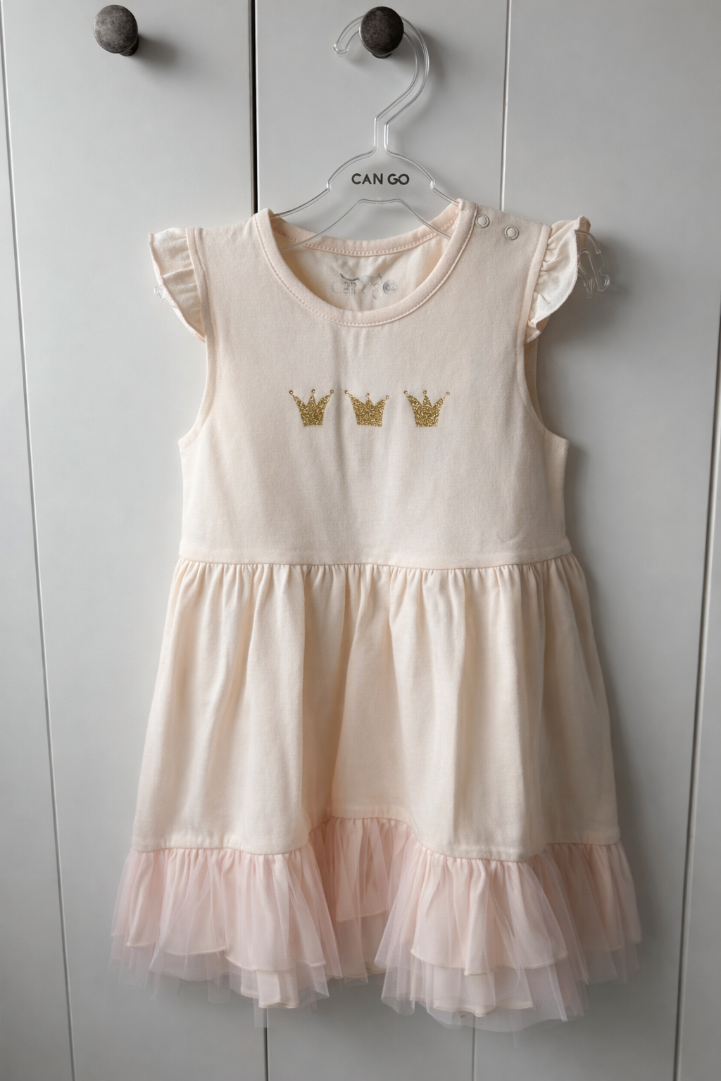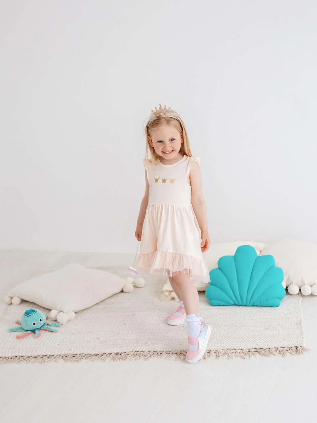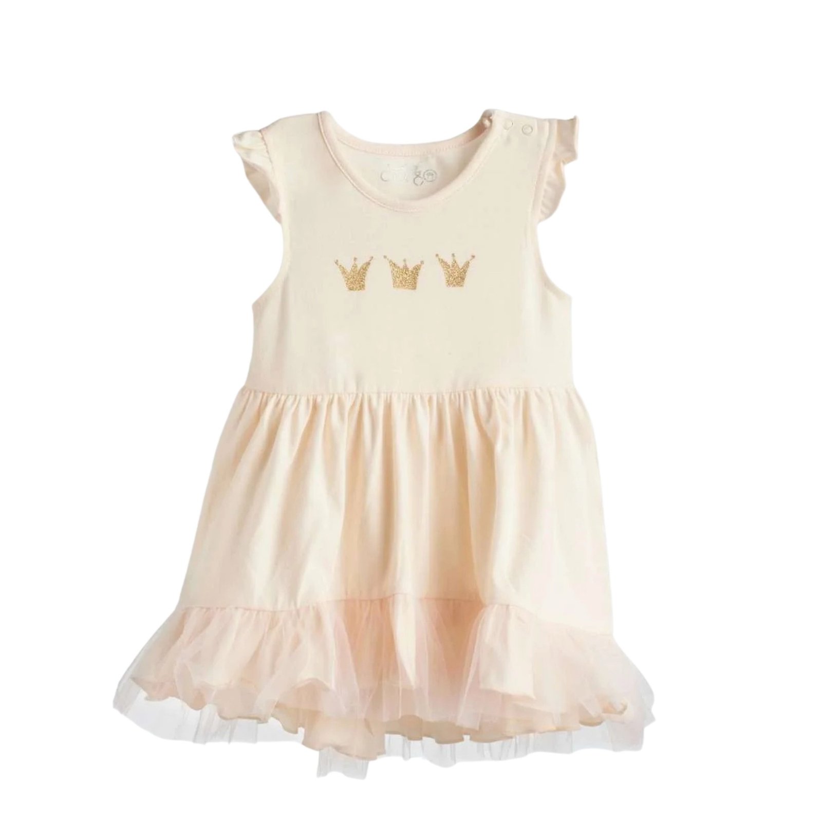 Gelsvos spalvos CAN GO suknelė iš „Gold Fish“ kolekcijos su karūnų aplikacijomis – labai princesiškas ir žavingas pasirinkimas mažosioms. Minkštas medvilnės audinys su elastanu užtikrina patogumą ir nevaržo judesių, o lengvas tiulio sijonas suteikia suknelei purumo ir šventiško žavesio. Puikiai tiks tiek kasdienai, tiek šventėms ar vizitams pas svečius. • Trumpomis rankovėmis • Lengvas tiulio sijonas