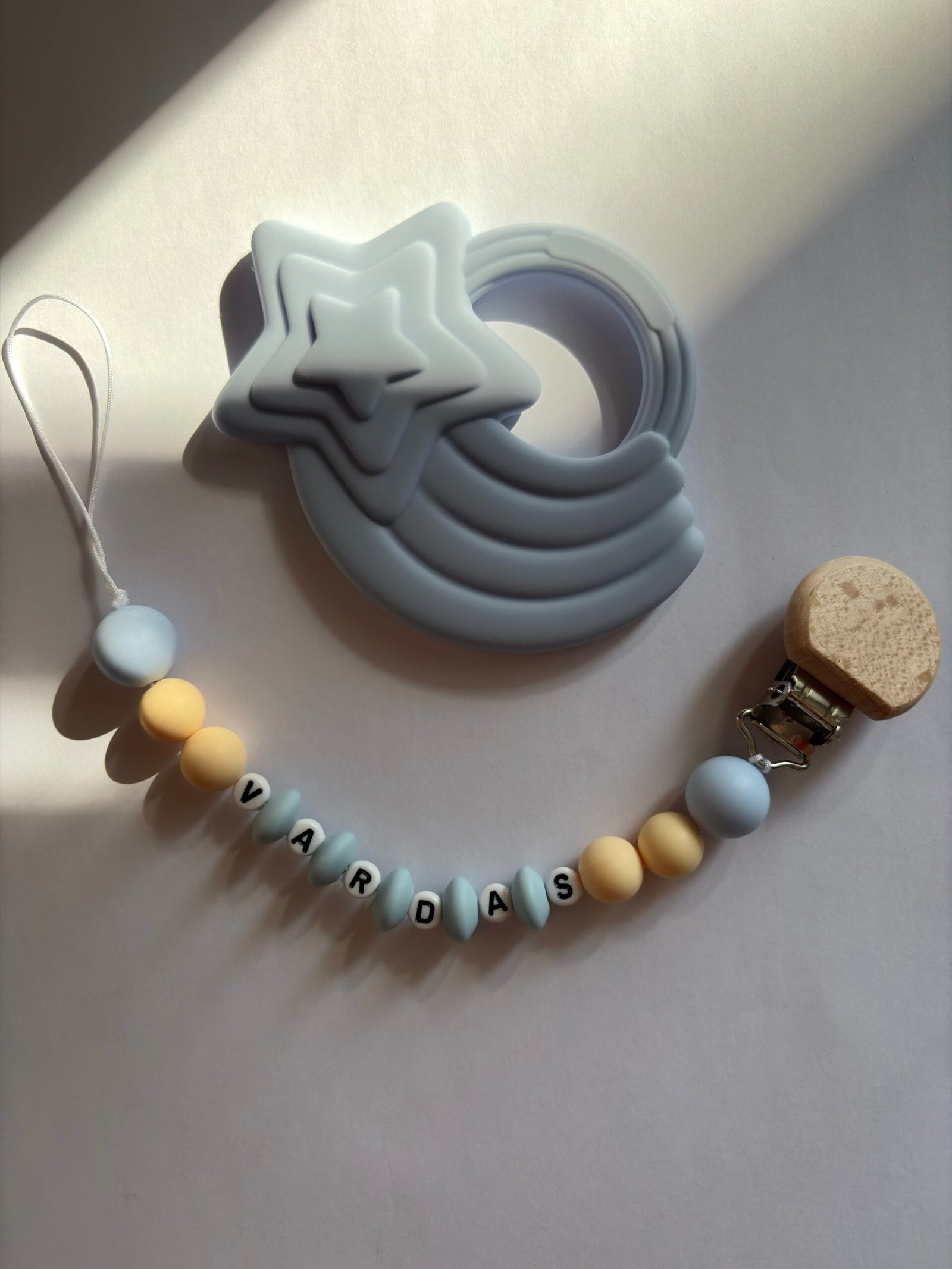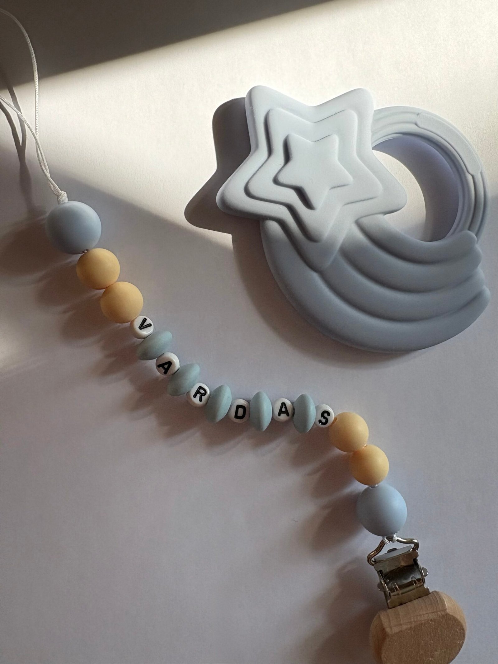 Čiulptuko laikiklis su vardu padeda išlaikyti čiulptuką visada šalia – jis nenukrenta, nepasimeta ir visada pasiekiamas tada, kai jo reikia labiausiai.